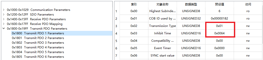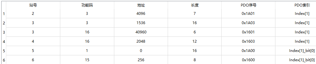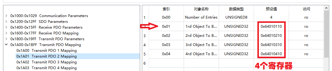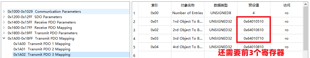 TPDO 0x1A01下可以保存4個寄存器,但是需求中讀取7個寄存器,所有要占用0x1A02中的3個寄存器位置。