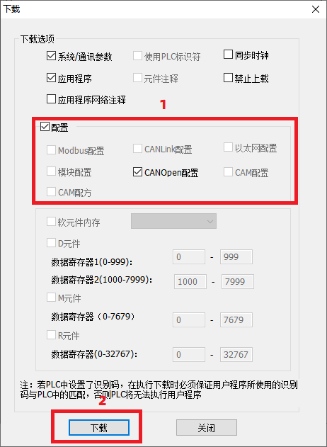 字典配置修改完成之后,要將最新配置下載到模塊中(如果模塊的CANopen接口已經和PLC連接,下載配置前需要確保PLC處于停止狀態。),還需要將模塊重新上電。