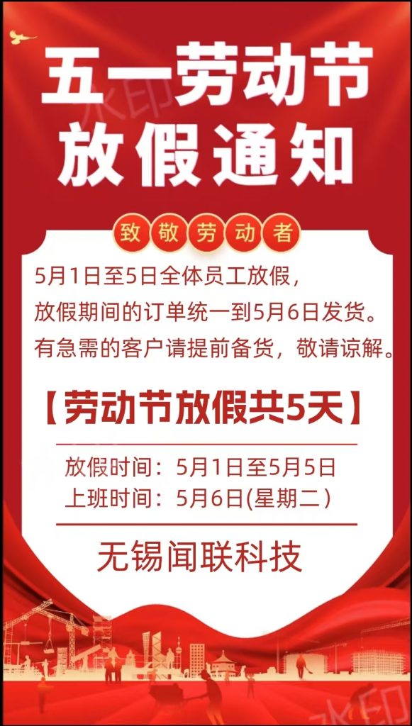 2025年勞動(dòng)節(jié)放假通知 發(fā)布時(shí)間:2025-04-26來源:無錫聞聯(lián)電子科技有限公司 聞聯(lián)科技2025勞動(dòng)節(jié)放假通知,5月1日至5月5日放假。 放假期間的訂單,統(tǒng)一5月6日發(fā)貨。 有急單的客戶請(qǐng)?zhí)崆皞湄洝?/p> 祝大家勞動(dòng)節(jié)快樂!